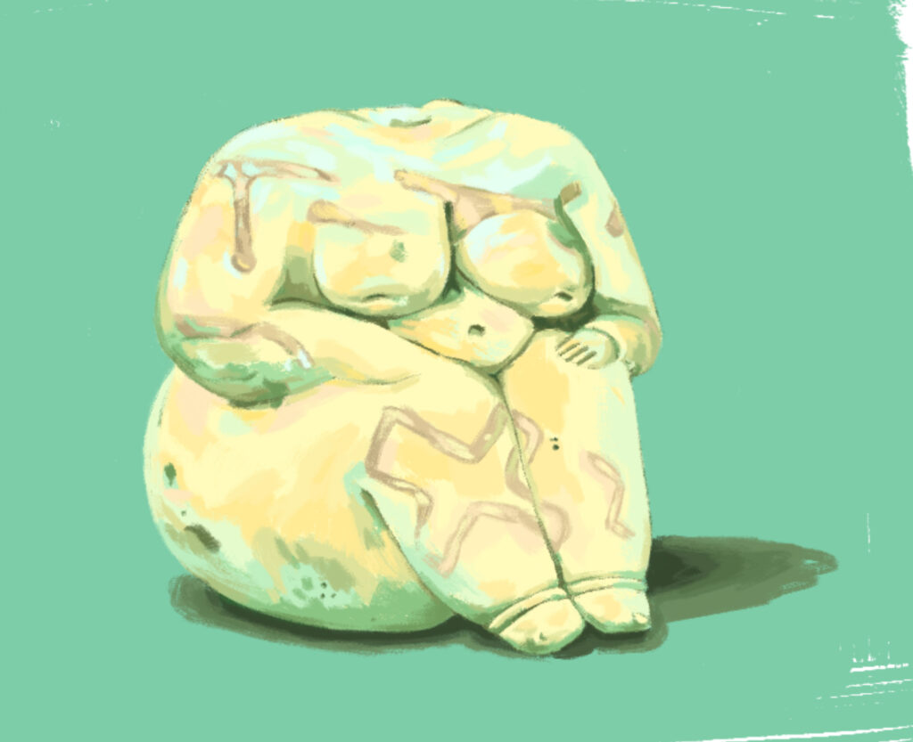 Étude d’après photo d’une figurine en terre cuite peinte, intitulée « Déesse assisse ».